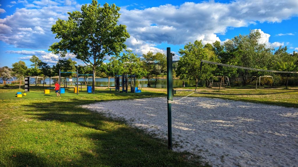 There is a beautiful lake for fishing with picnic tables and gazebos for shade, as well as a separate swimming area. It is located near the kids’ play area and sports pitches, and it looked like you could walk around the whole lake, although we didn’t have time this one to try the walk. I loved bringing my early morning coffee to the misty lake and watching the birds on the water.