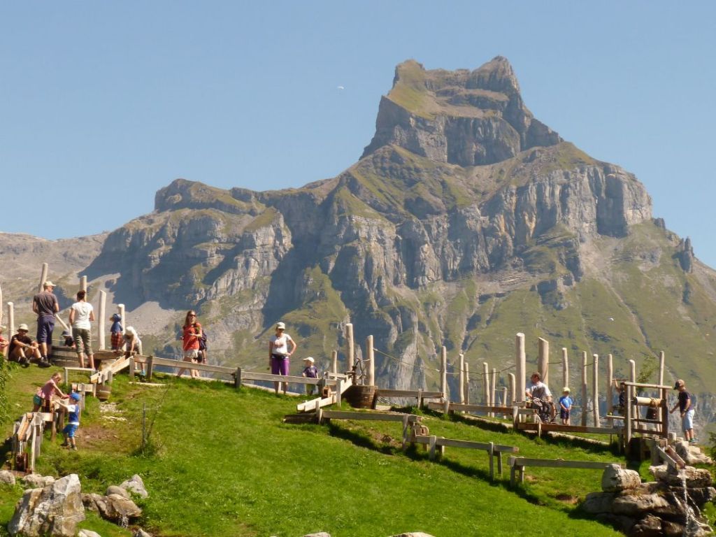 A short ride on the gondola takes you up to a beautiful water play park with ponds, water games, and equipment in an obstacle course for kids that involves climbing and balancing activities. It’s a great find, with beautiful scenery of meadows and mountains all around, and a cafe/ restaurant as well. We spent a whole morning at the playground alone, the boys loved all the different challenges. They also run a treasure hunt ( pay extra CHF 6). There are two short circular hikes that start here aswell if you fancy extending the day.