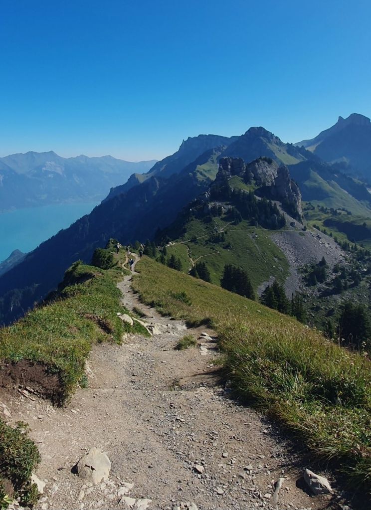 Highlights: From the train station, walk a short way up the hill to the play area and restaurant. Follow Panorama trail signs to follow the ridge line with spectacular views of Lake Thun and Brienz, looping round past panoramic views of the mountain range and back to the station.