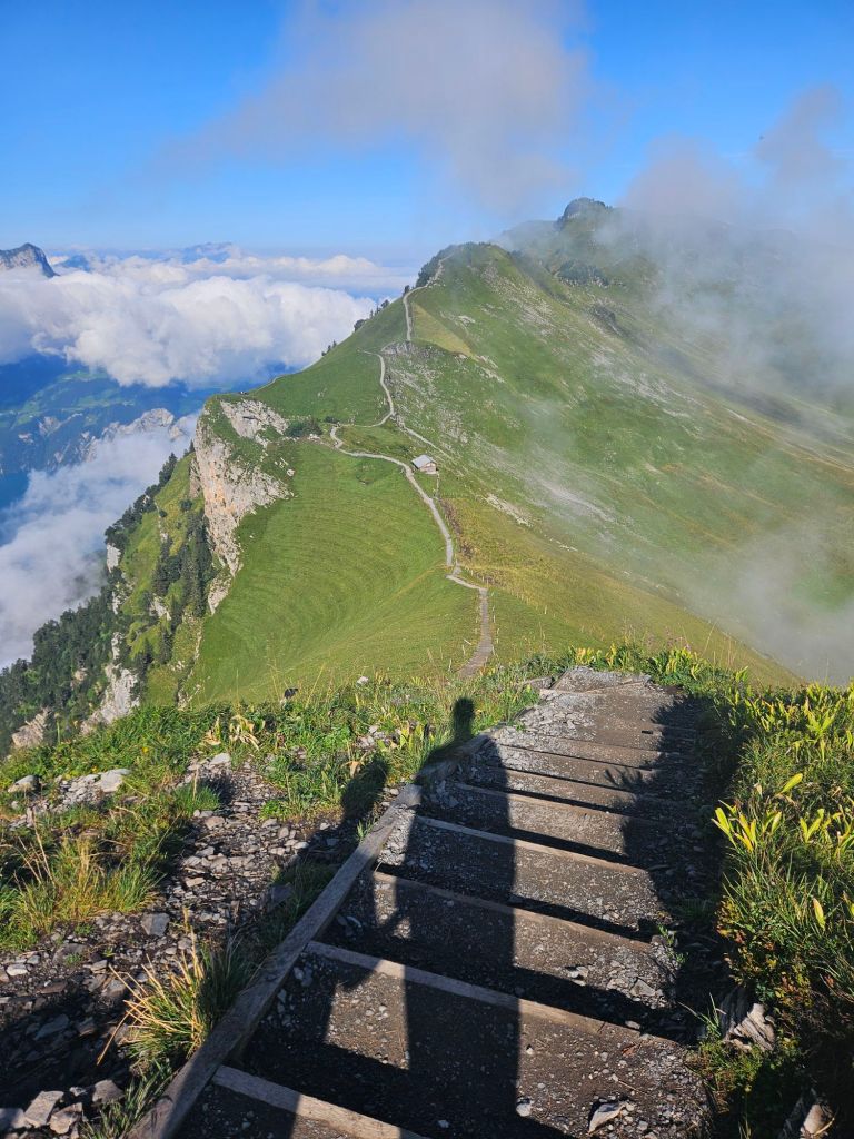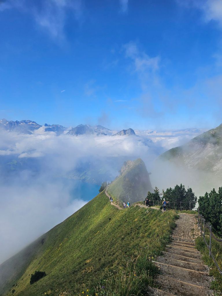 When we arrived at Klingenstock, we started the walk straight away. The walk is immediately jaw-dropping and remains that way from start to finish! You can see the whole ridgeline path stretch out in front of you and the Fronalpstock station in the distance.