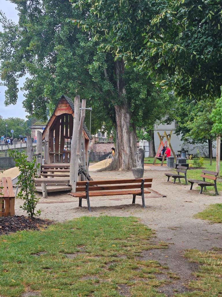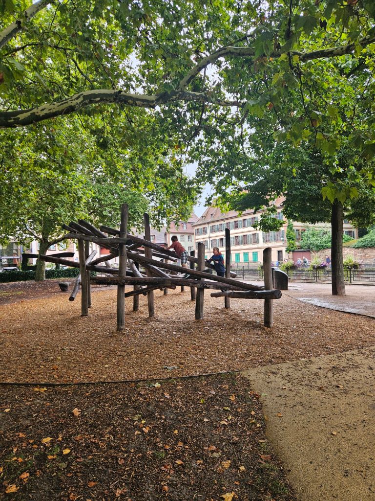 The picturesque canals of Petite France are lined with colourful timber houses, window boxes full of flowers and lots of shops, cafes and restaurants which are impossible quaint and very photogenic! We loved walking around the streets here taking it all in, but it was getting more busy and the kids were getting restless. We took some nice pictures and then crossed a delightful footbridge over the canal to a lovely playground in the centre of the historic area. The boys let off some steam, and we just soaked our surroundings in.
