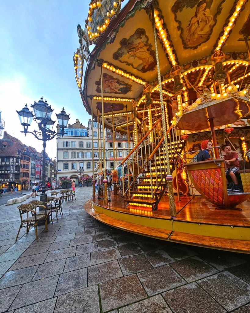 After a long while playing in the park for the boys, we slowly made our way back to the hotel, stopping for the kids to have a ride on the carousel on the way. I love how every town in France has one of these rides – the kids adore it, and they are so ornate and interesting to look at.