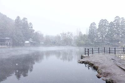 Yufuin is a peaceful town in Japan’s Oita Prefecture, nestled at the base of Mount Yufu, known for its relaxing hot springs and picturesque scenery. The town’s main street is lined with cute cafes, local art galleries, and quirky shops. In the town centre there are fountains and gullies filled with flowing hot thermal spring waters to wash your hands in which is just lovely. The town’s main street leads to the serene Kinrin Lake. After spending a day acclimatising to the town and having a look around, we headed to lake where we had a really nice coffee and cake while we watched snow fall in to the lake. It was stunning.