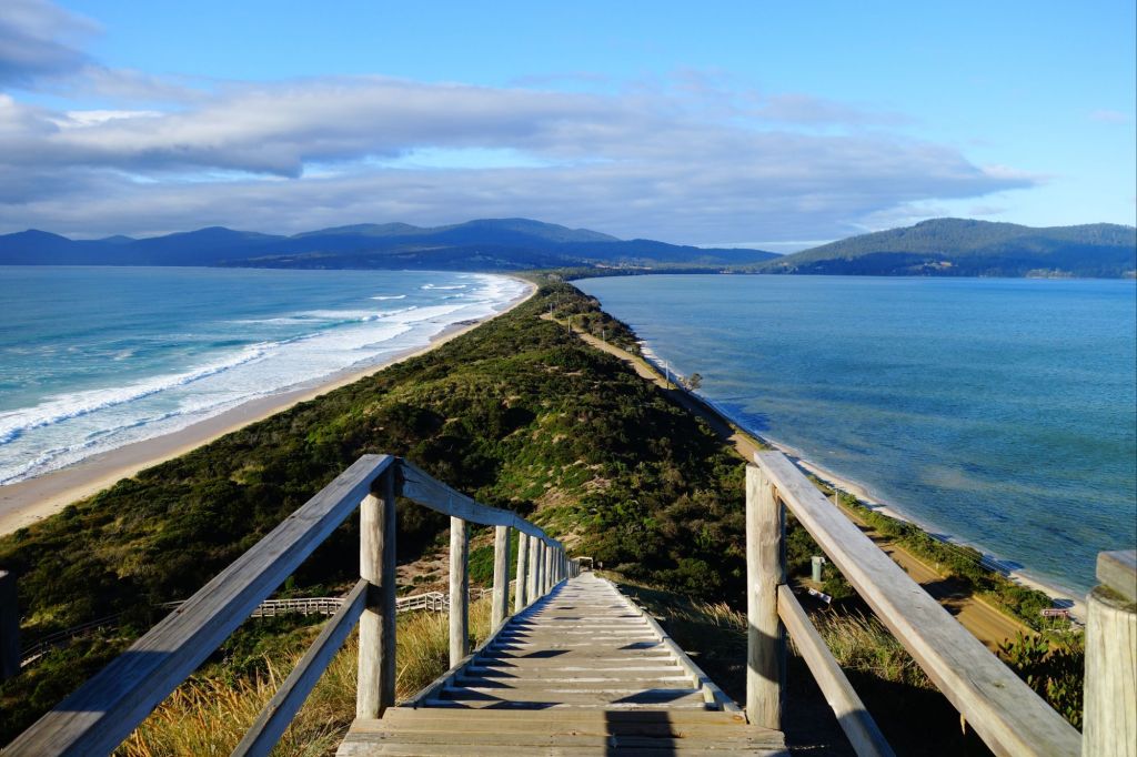 A wooden staircase leads up to the Truganini Lookout, where visitors can take in the breathtaking scenery where you can see the ocean on both sides of the narrow strip of land.